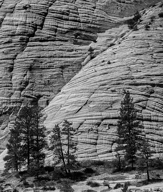 I applaud your instincts, those wavy horizontals hold my attention but more so because of the diagonal cut across them. The right half of the wall seems to me to have clear depth because of the lighter surface in the center of the image. From the shadows of the trees, I am assuming that the sun if overhead and that the light on the wall is because that is the least vertical in the image.