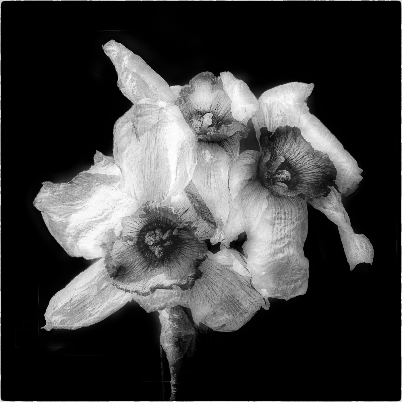 Michael - so I think it is a great subject (I admit I love dying flowers - not something I ever thought I would write). I think your two options here are extreme - and I would look for a middle ground. My version is your two images : ghosting around the edges removed and a 30% blend. Perhaps more crumpled bedsheets than ectoplasm, but I think a little more definition adds to the fragility. |