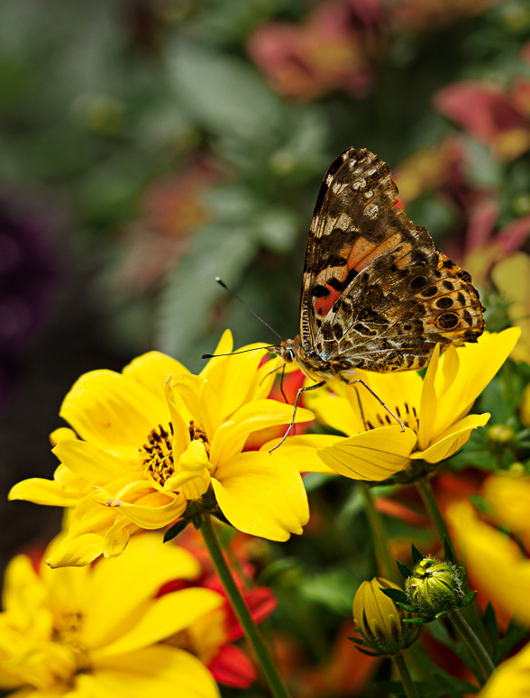 Lauren, lovely butterfly - and to my eyes well placed in contrast to the yellow flowers. I agree with the thrust of the previous comments in that I feel that the background is too dominant in color and so distracts from the patterning in the subjects wings.