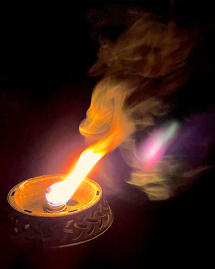 A lovely way to spend an evening. For me the range of colors is particularly striking. I cannot account for what seems like a reflection of the flame in the smoke, perhaps there was glass beyond (?), but I think this adds to the composition in providing a parallel resonance of the original.