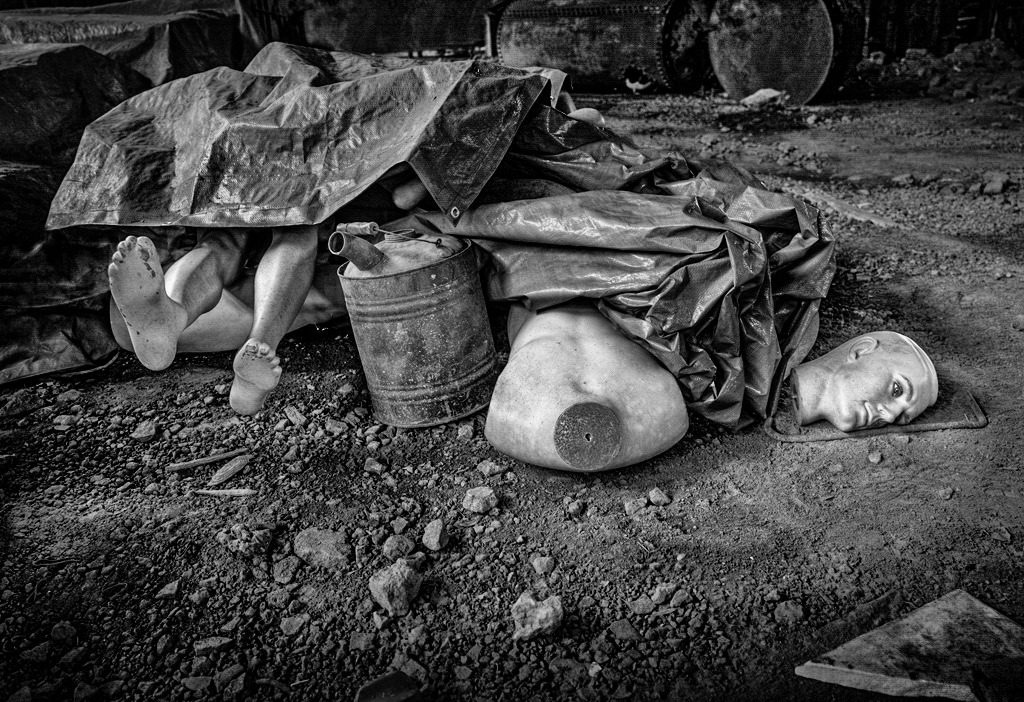For me, your image is a powerful composition, mostly empty in the lower half, detail in the center and crumpled tarp in the top: it is not I think traditional and so it creates the tension that resonates with the dismembered body.