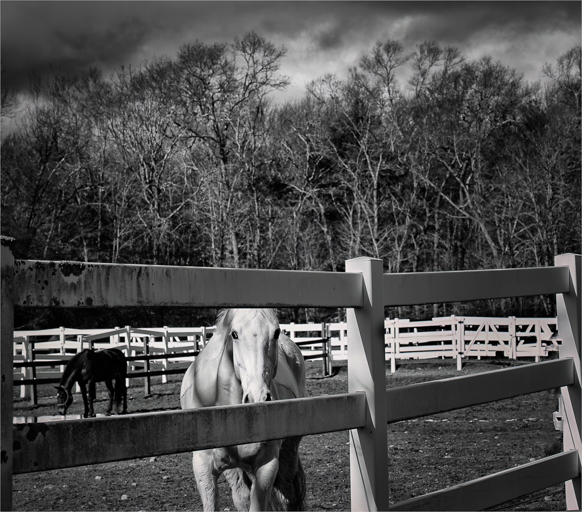 My suggest below stems is because I find the white rails at the back to be too bright. So in camera raw, I took your image and dropped the highlights, and then used two radial filters to retune and to add emphasis to the white-horse's face and to the sky. See if you like this manipulation. |