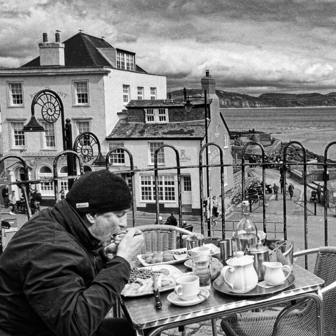 Great location - and I enjoy the man eating lunch. The contrast between his clothing and his eating outdoors really captures a determination to be "at the seaside". I agree though with your reservation about the image being busy. I think the background is most interesting as context for the diner, and so he needs a greater portion to establish him more clearly as the subject ... and so : |