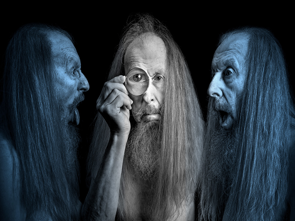 A great portrait - even with the single image alone. The "monocle" is so inventive and draws in the viewer. I see the side images as having a conversation and so this leads to the idea of an inner dialog (not quite the demon and an angel on your shoulders but along those lines).