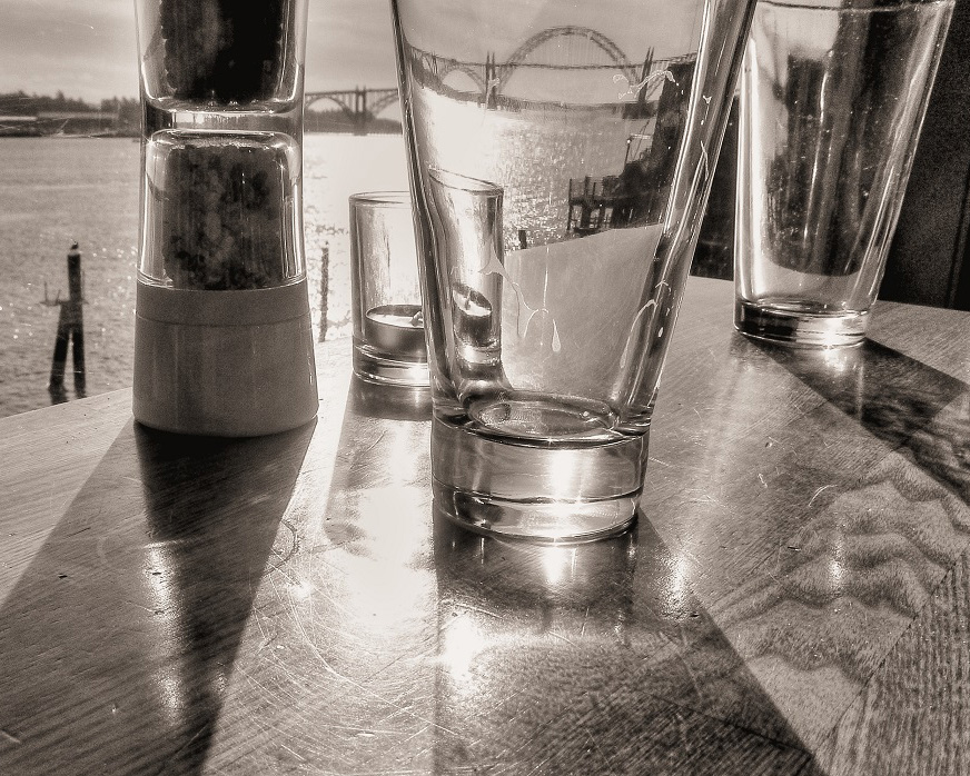 I line the use of the glass to distort the background, and the waves in the table that act as analog to the water in the background.