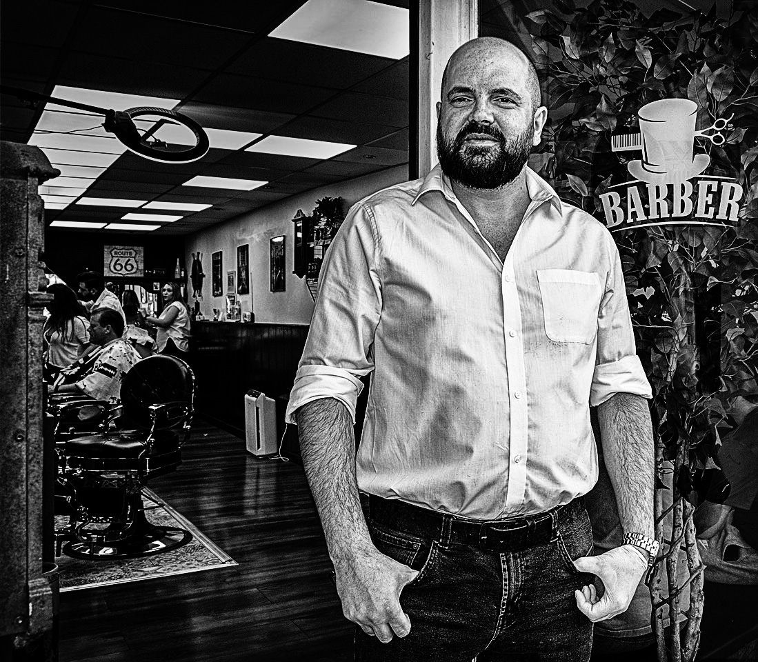 My approach would be to darken the outside, lower the brightness of the lights (less than the shirt), and dodge the Barber sign and his glove, all with more contrast to sort of toughen him up. It may not be authentic, but I think it adds interest.