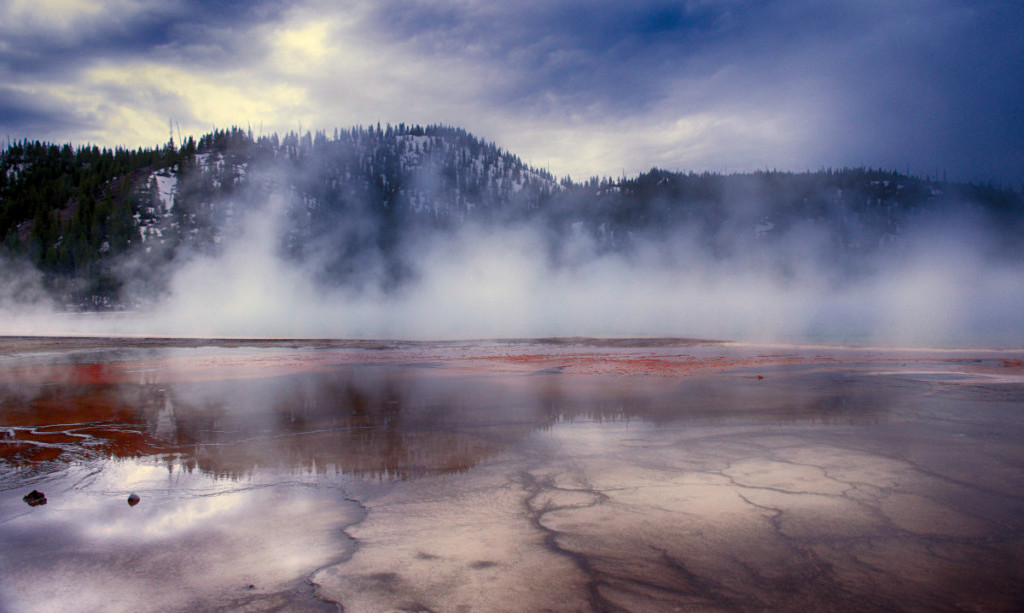 Hi Peter, Yellowstone NP is great for geothermal subjects. The mist over the reflective pool is entrancing. May, and there's still snow on the ground! I sense a blue cast...time of day, sun behind clouds...perhaps, and a slight shift in color balance adjusts that and brings out more of the red color in the pool. A wee crop at the top helps my eye settle on the misty pool as well. A lovely ethereal image...well done! |