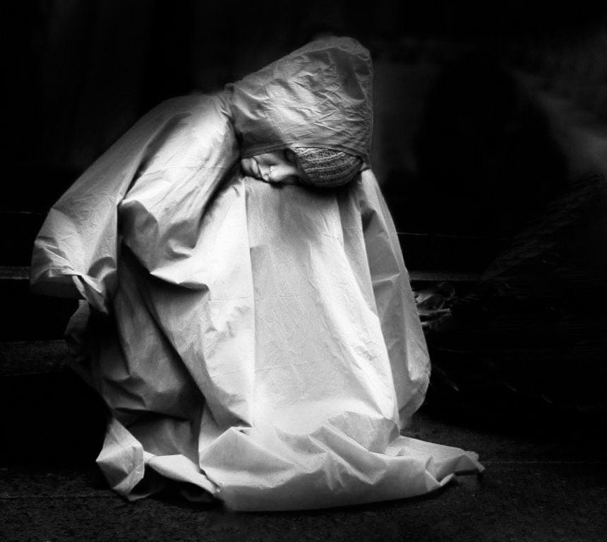 It is a very powerful picture. Darkening the background makes it stronger and flipping horizontally again was clever.I don't see what I could do to improve this picture. Maybe the light area on the upper right could be darken a little bit more? Great street photography (very sad) picture. Kudos for not having been shy to take this uneasy photograph. Thank you for sharing |
