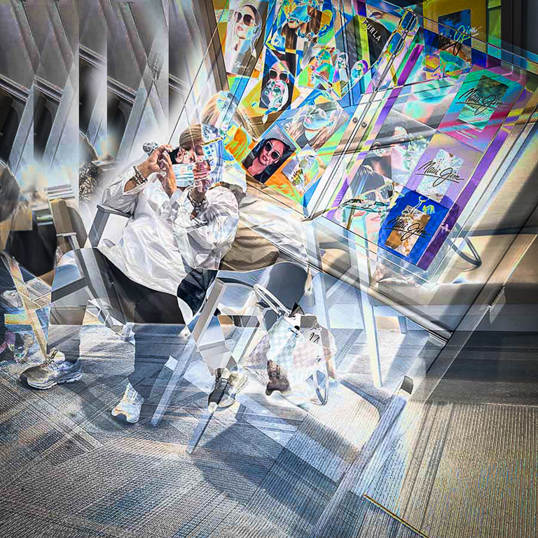 Very dynamic image. I see a lot of leading lines toward the subject who could be a Musician ( in my dream) or the hairdresser relaxing on his chair. I like the upper colorful corner. But I don't like the empty opposite corner ( upper left) with the black weird shape (sorry).