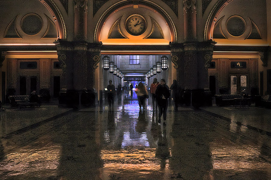 This image was taken in a building in the city of Melbourne. You are standing in a huge domed foyer and looking down a corridor towards an exit door. There are many buildings that provide office spaces and walk-throughs in the centre city. |
