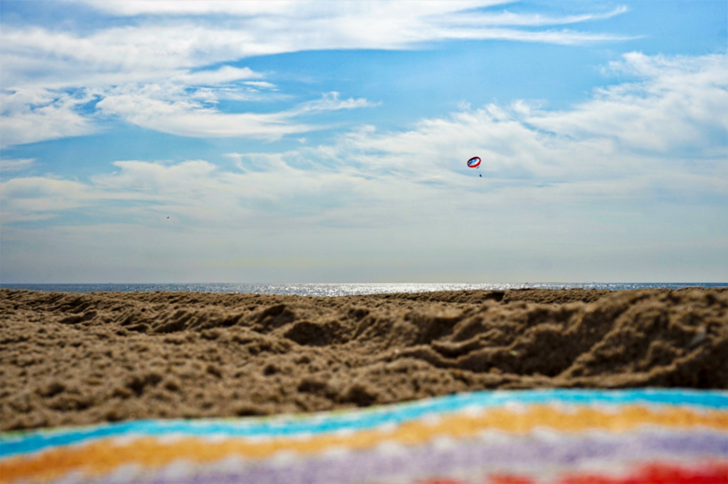 I like the layers and the balloon is a nice reward. I tried to adjusted the image a bit to tone down the sparkle on the water and the brightness of the blanket. I tried a crop without the blanket, but that makes the lack of focus on the sand standout and it doesn't read as well. |