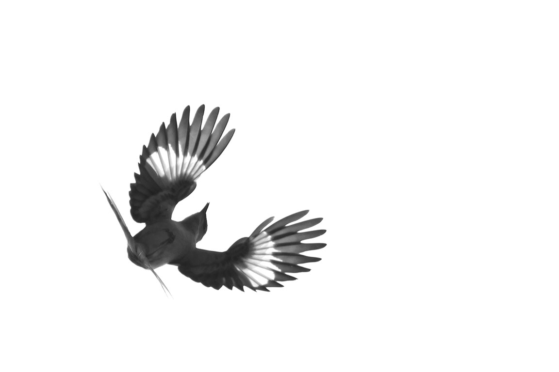 I find this a very striking image of a bird in flight enhanced in its impact by the white background. To me the image almost appears like a charcoal drawing. The negative space does not bother me as I like the space to which the bird can fly into.