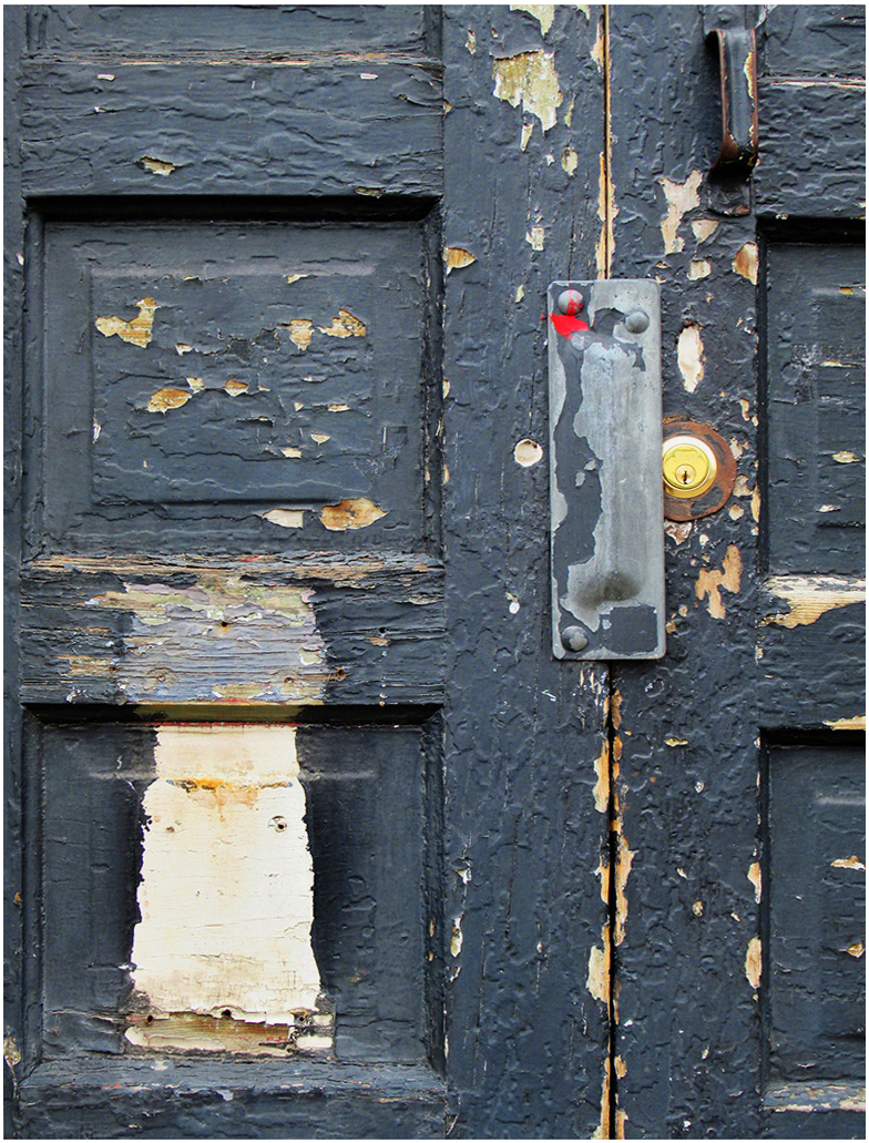 In my opinion this cropped version keeps viewer's attention more on the worn down details of the door.