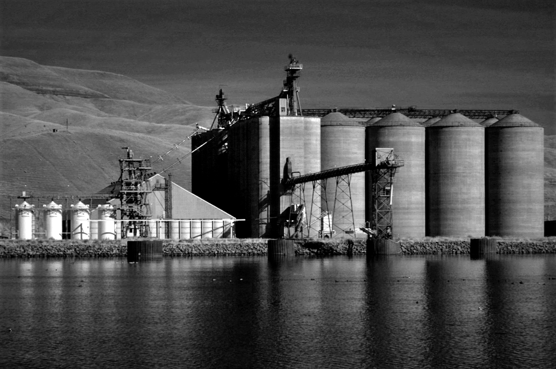 Bill, thanks for the technique of the infrared photography by changing the sensor in a normal camera. Your image is a nice capture of the grain silos with the dark sky. I see good details in the silos and the machinery and find it in good composition. The reflection in water enhances the presentation.