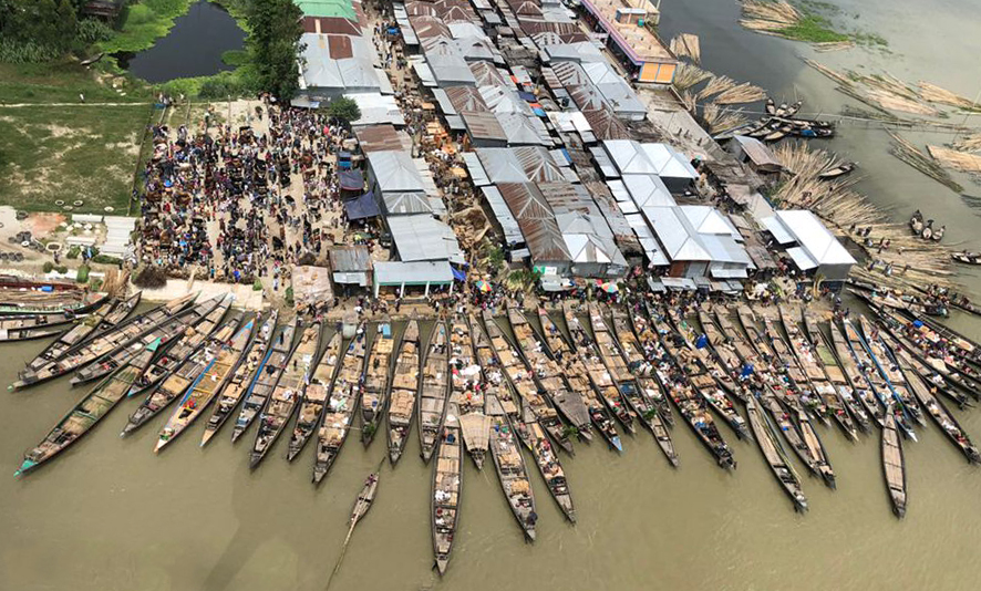 Your image covers a large area and is in good sharpness but lacks details. If it were mine I would straighten the image and crop a little on top to emphasize the pattern made by the boats as that is what attracted you to take the image.