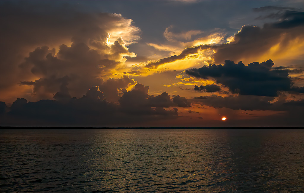 Sophia what a beautiful sunset you captured. You did a great job enhancing the colors in the sunset that are shining off the clouds and water. What a great "hand of God" feeling to the photo. However, there are black lines circling the sun just inside the outer edge that do bother me when I look at it. They make the sun look a little fake. I do not see these black lines on the original photo. Is this something you can correct in post-processing? I know some of the sunset reflects on the surface of the water, but I think there is a little too much water shown in the photo. The real action is above the horizon line in the sun and clouds. I would recommend cropping the bottom edge of the photo just a little so that the bottom rule of thirds line is at the horizon, see attached edit. |
