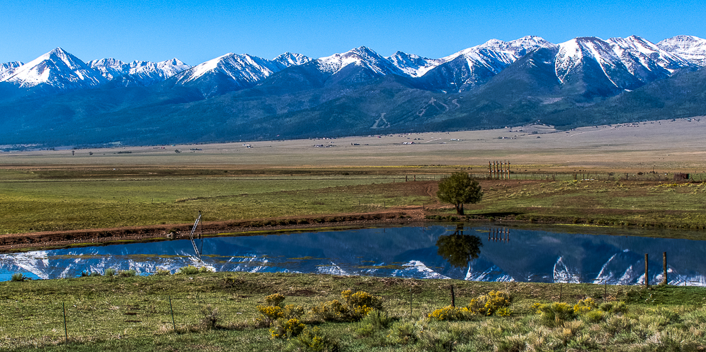 This was private land and there was another fence between me and the pond that I shot above. I did raise my camera up so that I could capture more of the snow-covered mountains reflecting on the pond's surface.