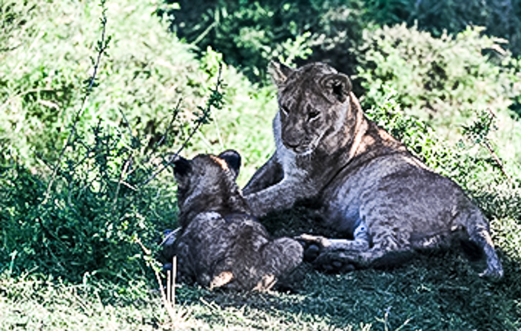 Jeffery I think you did a great job capturing the mother's look at her cub. I admire your patience in waiting to get this shot. Which I believe was your vision, to see the mother looking at her cub. I also like how you brought the lions out of the shadows. I do think the phot would look more interesting if the mother lion was not cropped into the middle of the photo, see my photo edit.