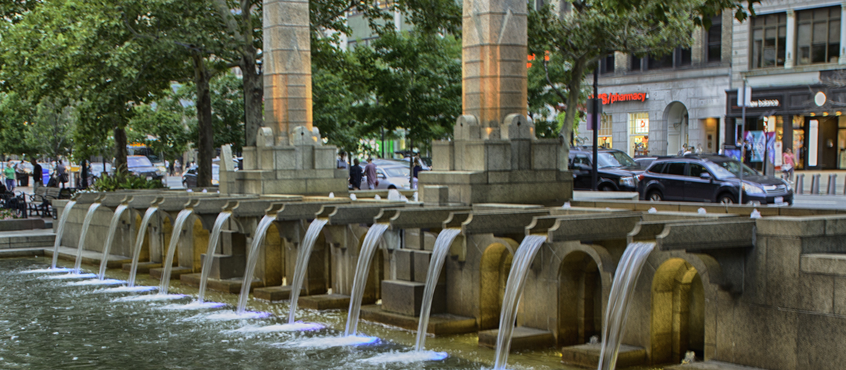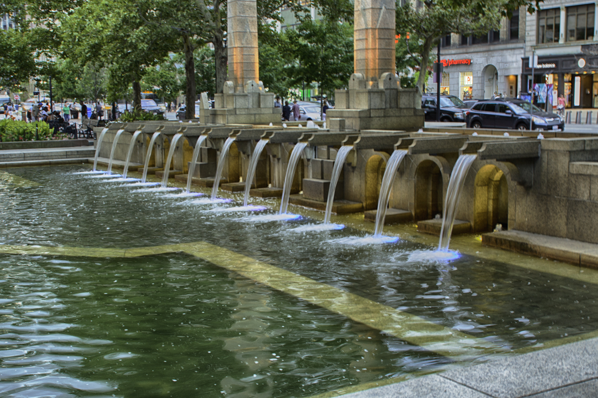 Here is the image cropped. I felt it lost something when I cropped it. I couldn't change the angle and have the same effect of the fountain. I liked the street action as I felt it added something. |