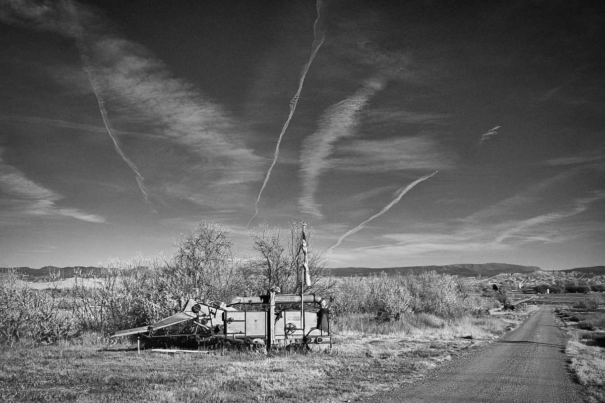 Chuck, I like this scene with the road on the right and the wispy clouds leading to the old combine. Old country roads and equipment make for great images. I see your ISO was at 2000 so I see noise in the sky. My eye tends to go directly to the combine due to its brightness. I took the image into photoshop and used topaz denoise to take down the noise a bit and then in camera raw I took down the highlights on the combine and the area to the right of it and increased the contrast just a bit. Let me know what you think. |