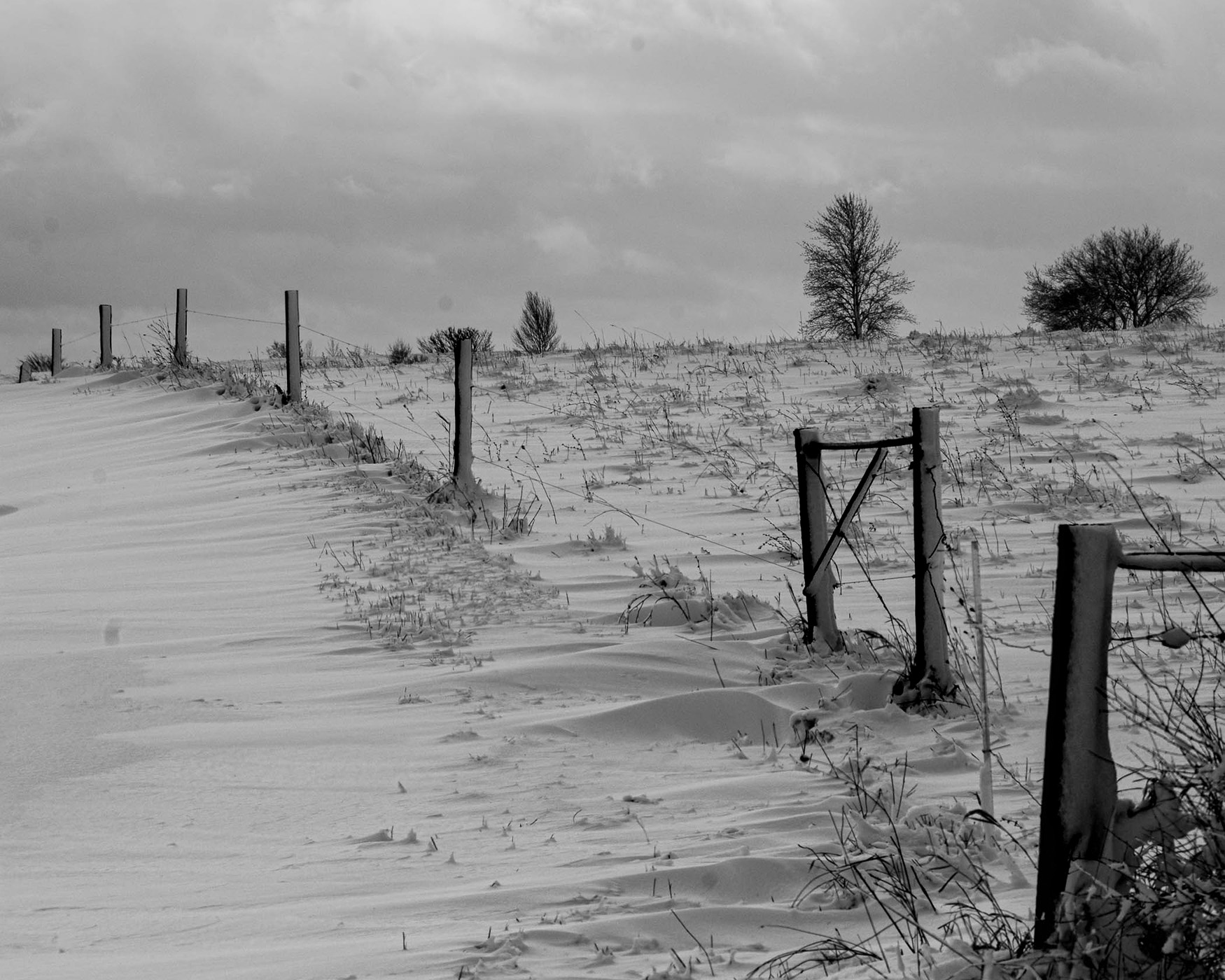 Karl, this image is nicely composed with the angle in which you took it and the fence leading into the winter scene and over the hill. It seems too gray to me so I tried to whiten up the snow without losing the shadows and added contrast to the sky. Then I tried to darken the fence posts (that did not turn out so well!) but you get the idea. When I did all this your lens spots showed up. I was trying to highlight the whiteness of the snow a bit and delineate it more from the snow. Let me know your thoughts on the idea. Great composition. |