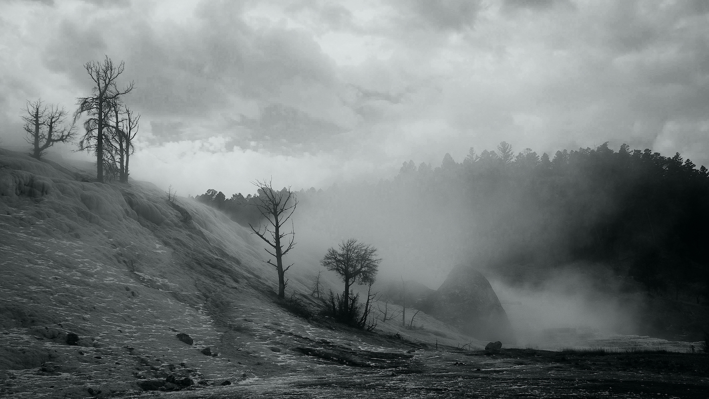 The reason I mentioned fire is because two summers prior to your photo there were three named fires in the park; the Alder Fire, the Druid Fire and the Alum Fire. I am not familiar with the geography of the entire park, so I am not sure if these fires burnt the area of the Mammoth Hot Springs. The other reason is that the trees in the foreground resemble ones that have been burnt versus the trees on the in the background. |