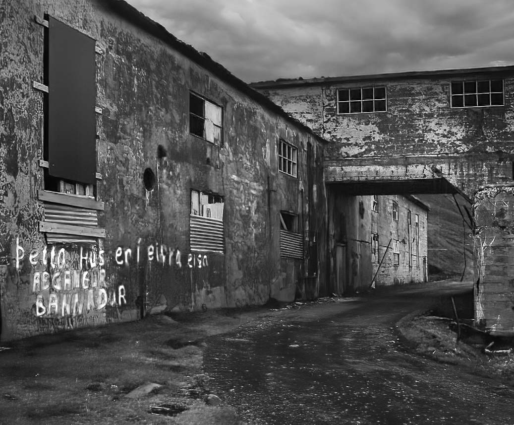 Nice mood. Did you think about b/w. I tried it. I cropped in on the left because I didn't think that missing surface in the wall helped and on the right because my eye kept getting drawn to that door, away from the road. It's the road that works really well with the photo so I would make sure nothing distracts from that