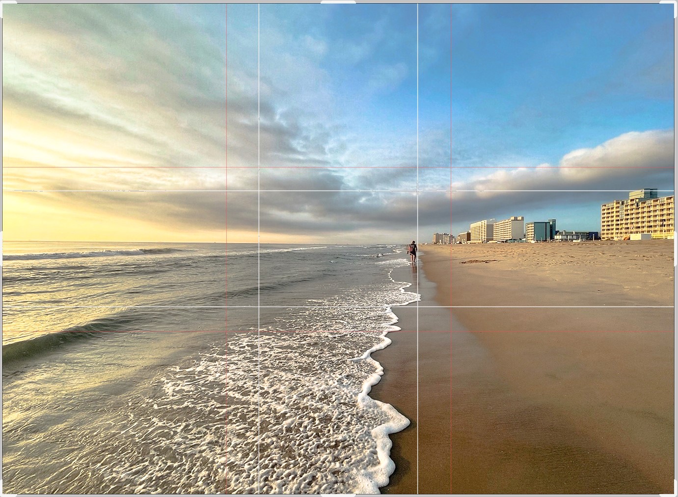 Dear Ms. Kieu Hanh, thank you for sharing a very attractive mobile phone photo. Before this pioneering landscape photo, I feel very comfortable because there is a spacious and empty space of nature in its composition. The leading lines you have used are the border of the white foam waves full of contrast and the dark shadow of the descending wave is very clever and clear. You've found a point of interest (treasure hunter) to bring the viewer's eye to the end of the leading lines. I really admire the way you have captured the light, it's such a nice balance. Sharpness is the strong point of this photo, I can hardly tell if this photo was taken with a phone or a camera. The highlight of the clouds is very prominent, increasing the depth of the image. The pattern of wave foam extending from the front to the convergence point in a triangular shape adds more depth. I took the liberty of taking the photo and using the ACR Geometry tool to correct the distortion caused by the phone's wide-angle lens. Also I try to use Golden ratio in PS to crop (the white lines on image below) to contribute more. |