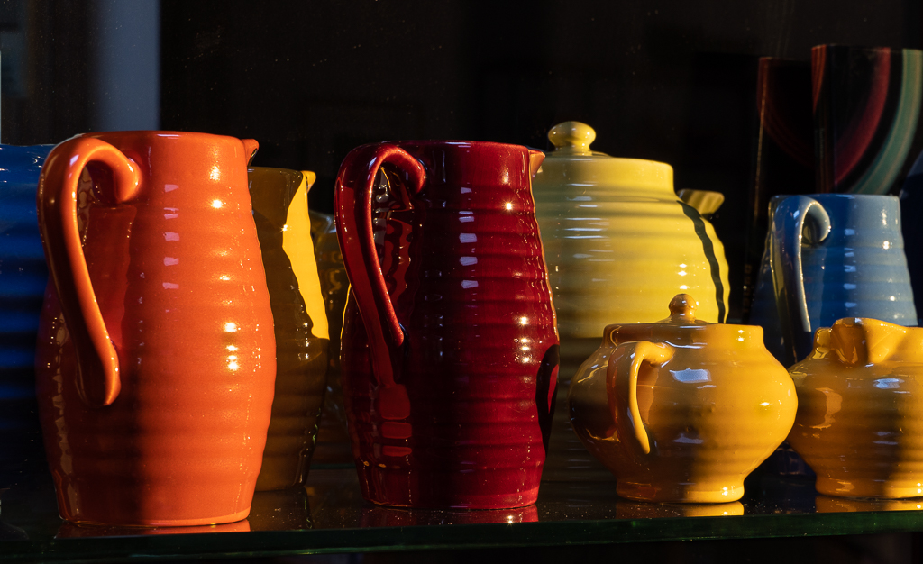 Randolph, it does kind of look like a lid. It's actually the rim of the blue pitcher that is sitting behind the orange pitcher. ...but your observation brings up a conundrum! I'm at a loss to explain why the color change! I've attached another image that was taken at a slightly different angle and as you can see, the pitcher is uniform in color. I went back in the history of my LR edit to double check the original and it shows that the image was captured with the two different colors. I can only surmise the changing natural lighting conditions combined with my cameral angle caused the anomaly. Does anyone else have a better explanation? |