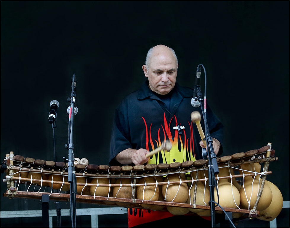 Kieu-Hanh, I love this image! Your subject is well positioned in the frame...and is framed by the two microphones and the instrument. He is intent in what he's doing and I particularly like how your shutter speed was slow enough to give motion blur to the "drum" sticks. I know monitors differ, and on mine there is only slight differentiation between the black background and the black of the musician's T-shirt, giving the impression of a floating head. That last comment aside, it is nicely done. |