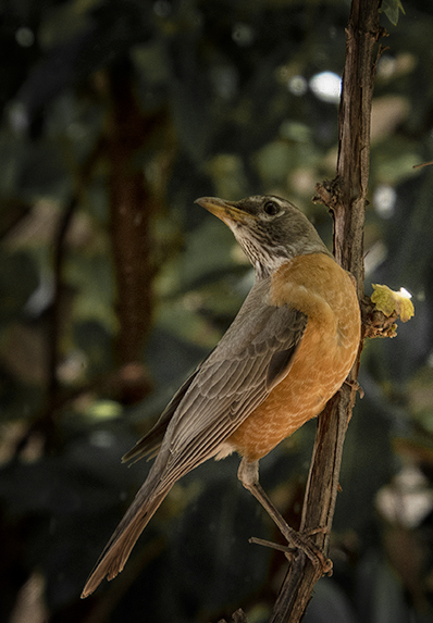 Mary Ann, what a lovely capture of this Robin ..especially so with its unusual pose. Very sharp and nicely exposed. I, too, agree that the branches are extraneous. I wrestle with how much context to keep in an image and I've tended to go the opposite of LuAnn and zoom in for the close-up. I took your image into PS for the crop then used the Color EFX Pro plug in and used the "Add Detail" and "Darken/Lighten Center" filters. Then back into PS to darken and desaturate the background to call more attention to the beautiful bird. |