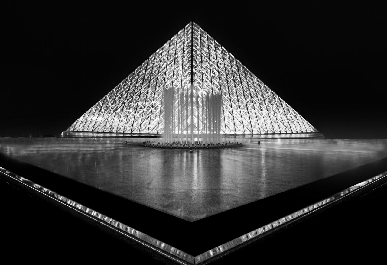 Lisa, this is a lovely image both in color and monochrome. I really like how you brought out the luminosity and detail in the pyramid. Your choice of a small aperture gave a lovely starburst appearance to the distant lights. I do, however, find the highlights of the reflections on the wet pavement to be slightly blown out for my liking. I reimagined the scene two different ways. In the mono version, removing the museum and doing a quick and dirty (read: poor) job of cloning out the reflections. Then I took your original, made a copy and flipped it and merged the images which made the right side a mirror image of the left. Let me know what you think. |