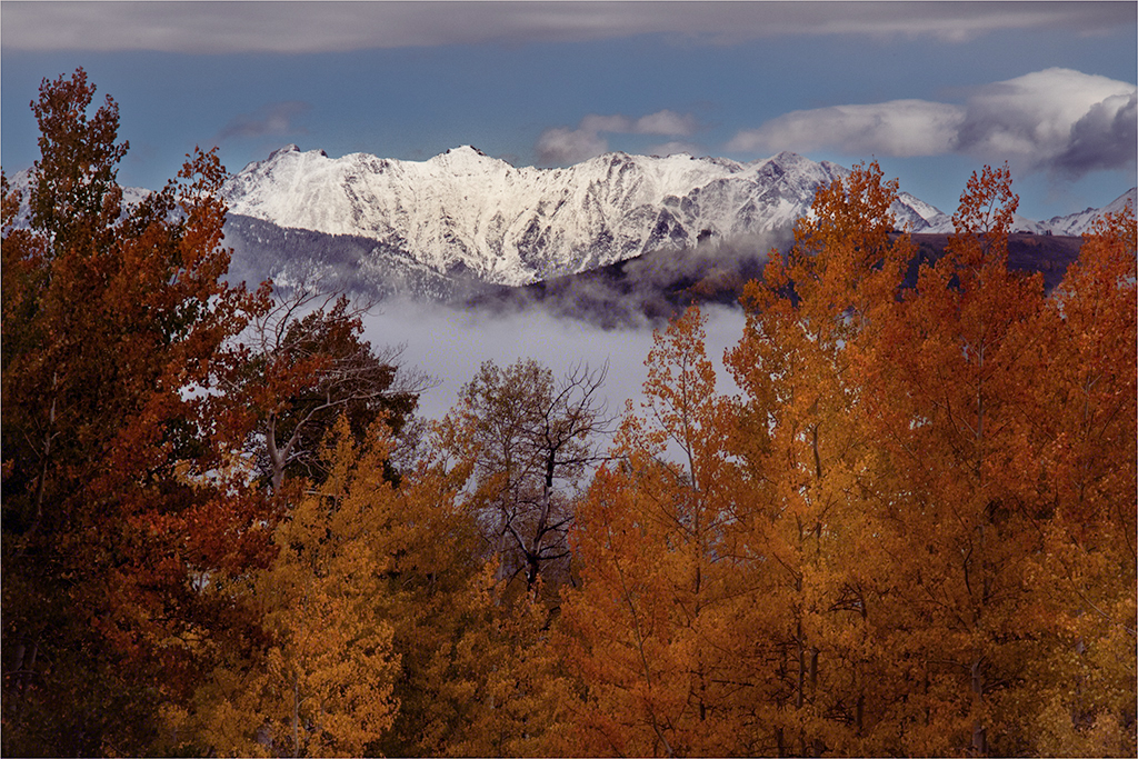 Hi Ruth. I like everything about it!: My eye goes first to the foreground trees where I appreciate the nuances of color and texture that creates a beautiful frame for the distant mountains. I linger there and let my eye move to the fog in the valley which creates a lovely separation and transition between foreground and background. Next my gaze goes to the "colorado" (I'm sure you know that means "snow covered" in Spanish) peaks then on to the sky with its white, fluffy clouds. I think you've done an admirable job with the dodging and burning in the trees which creates a subtle separation of the layers of trees and gives the image depth. I provided some visual feedback...which isn't really as much a suggestion for improvement as it is merely a different rendition. I tend to like very vibrant colors that are not to everyone's liking. In my version I added multiple radial gradients in the trees to try to bring out even more depth. I added some clarity and gave a slightly warmer tone to the snow and added a little magenta to the shadows.