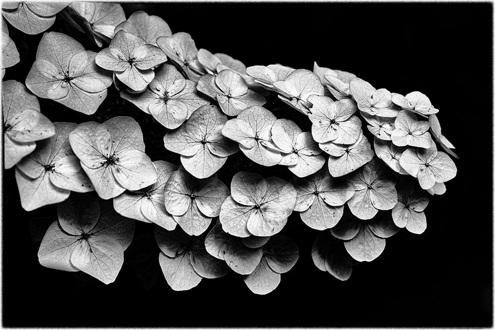 Gerard, what a lovely image! The more I see work like yours of flowers rendered in monochrome, the more I like it. You have a nice composition and I like the fact that you didn't pull up the shadows, but left them dark. The image is sharp with lots of details to enjoy. Black background was definitely a good choice, but on this forum, your image boundaries get lost. In my visual feedback I did two things: In Silver EFX I chose the Fine Art preset and bumped up the clarity to +20 to ever so slightly emphasize the veining on the petals and I added a border to set it off when viewing on a black background. It's a beautiful image and well done, indeed! |