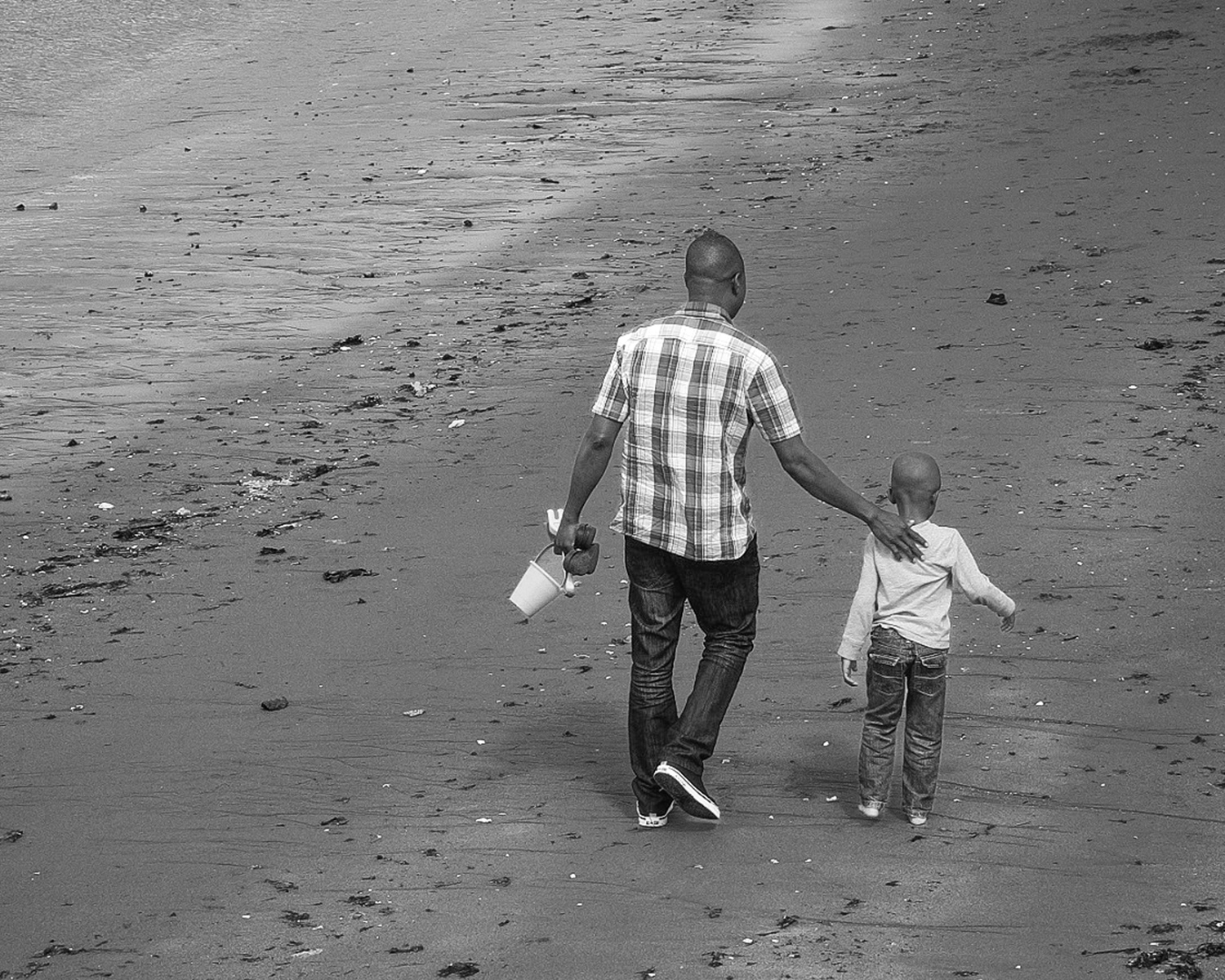 Hi Kathleen. It's amazing how one little thing can turn an ordinary picture into something special! Your image tells a great story with a strong message and it is a fantastic composition. To be honest, though, I'm not sure your edit is working for me. I'm not liking the sepia/graininess and to my eye there are some blown-out highlights especially on the pant legs, shirt and top of their heads. Your original image has really nice separation and contrast between your subjects and the surrounding sand but in your edit that seems to have been diminished. I have provided an alternative edit for some visual feedback. Of course, all of this is subjective and I respect your artistic choices. Regardless of editing choice, the image itself is very strong and well captured. Thank you for sharing this precious moment with us. |