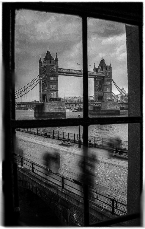 Randy, I really love your image! It is a lovely capture, creatively framed through the window and beautifully edited. Save for the people in contemporary dress, it has the look of an old-time glass negative image from the 1800's. After reading your commentary, I got to wondering what it might have looked like had you been able to take a long exposure to blur the pedestrians as if they were real ghosts of those who were tortured and died in the Tower. I took the image into Ps and did a motion blur layer with a mask. A reasonable facsimile of an in-camera slow shutter speed. |