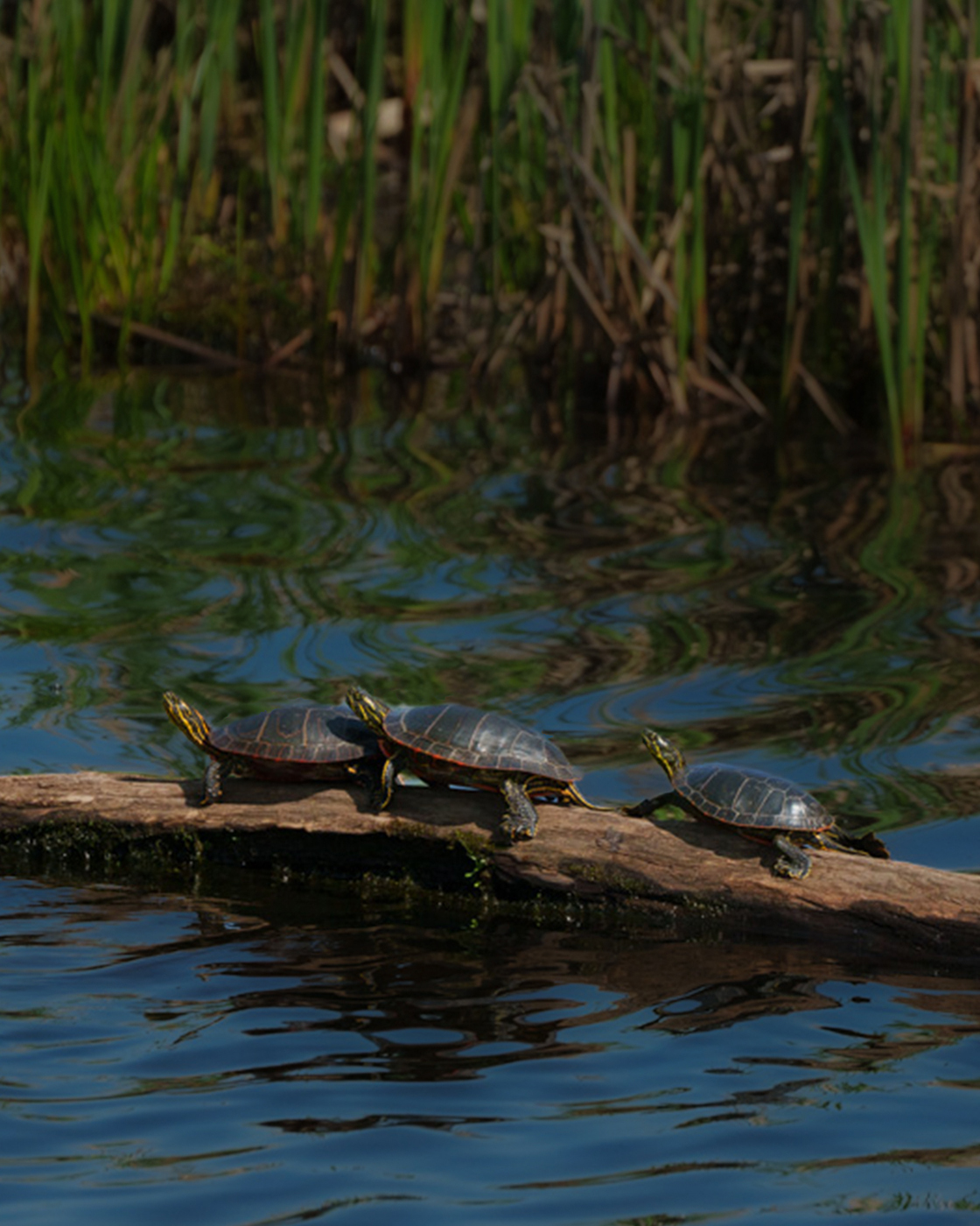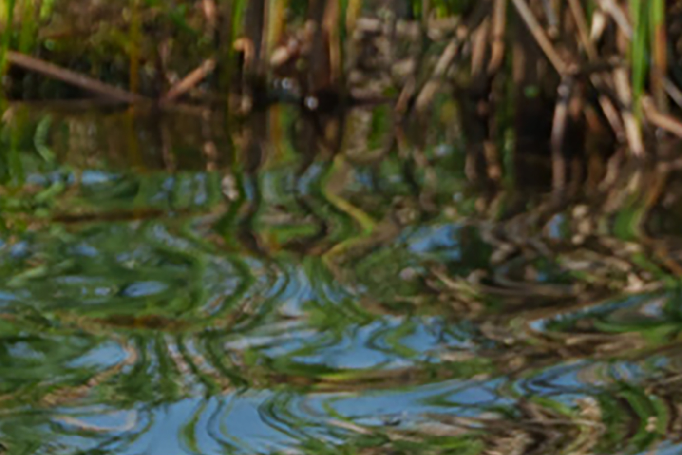 If your intent was for the turtles to be the subject, I offer two different versions. In the portrait version, I included some of the reeds to add some additional context. In the 2:1 version, I've honed in on just the turtles. In both instances, I decreased the exposure of the background and added some negative clarity, negative detail and negative texture. In the third iteration, I did a tight crop on the water abstraction as an entirely different composition. |