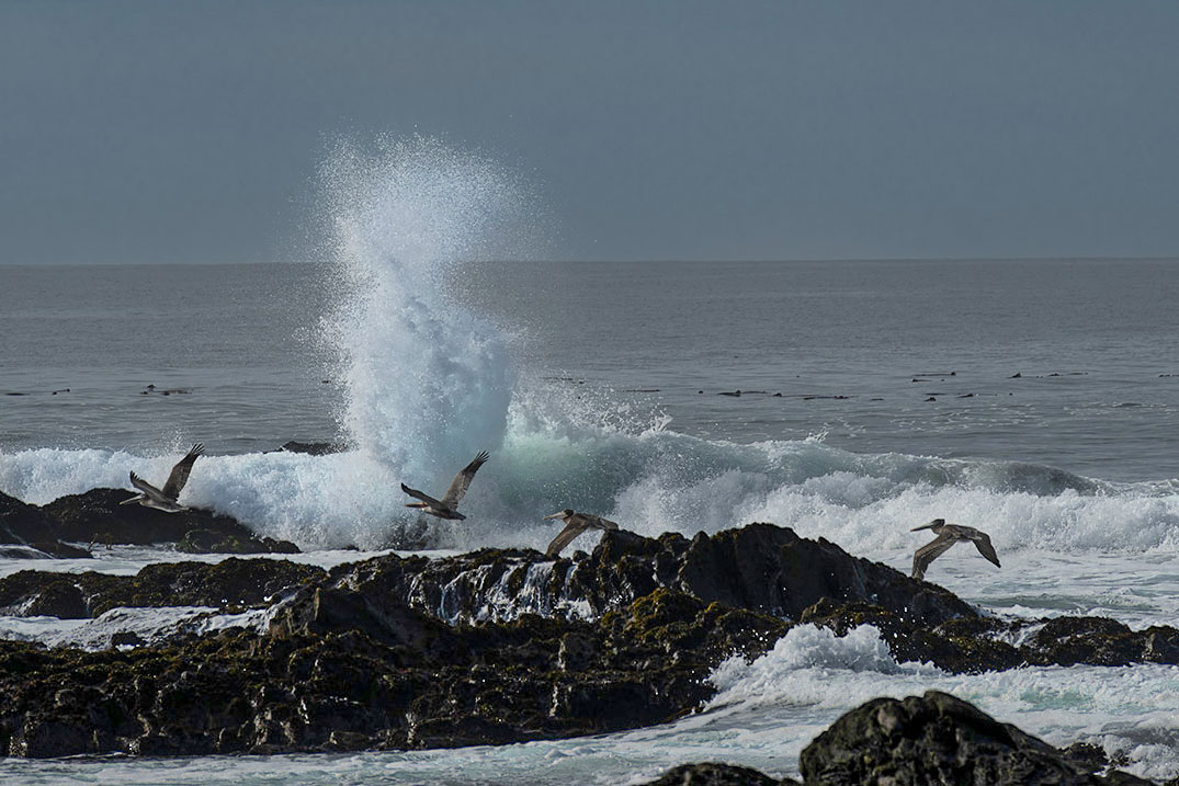 The CA coast certainly has an abundance of photogenic scenery. Good job of catching the pelicans in flight at the exact moment of that dramatic wave crashing against the rocks.