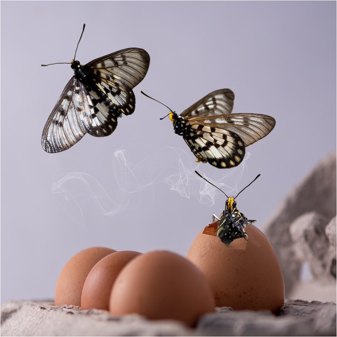 Love what you have done with the cage and the eye-leaves. I wonder if there could be an improvement to the amount of perspective applied to the plane to make the back smaller (ie, increased perspective). I use Edit/Transform/Distort in Photoshop. And I would try Edit/Transform/Rotate to turn the back of the plane so that it points directly at the cage it has escaped from. |