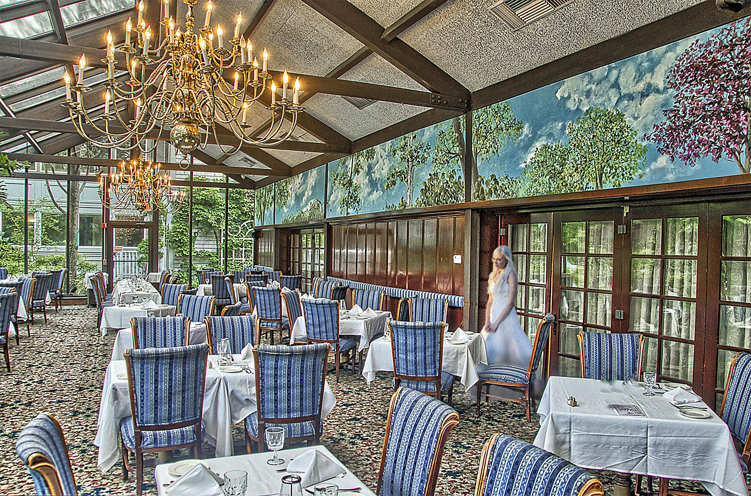 The bride is almost missing in action in your restaurant because she is so for to the right. The original photo of her shows me patience and forbearance in her posture. To me, she looks like she is waiting. Patiently.