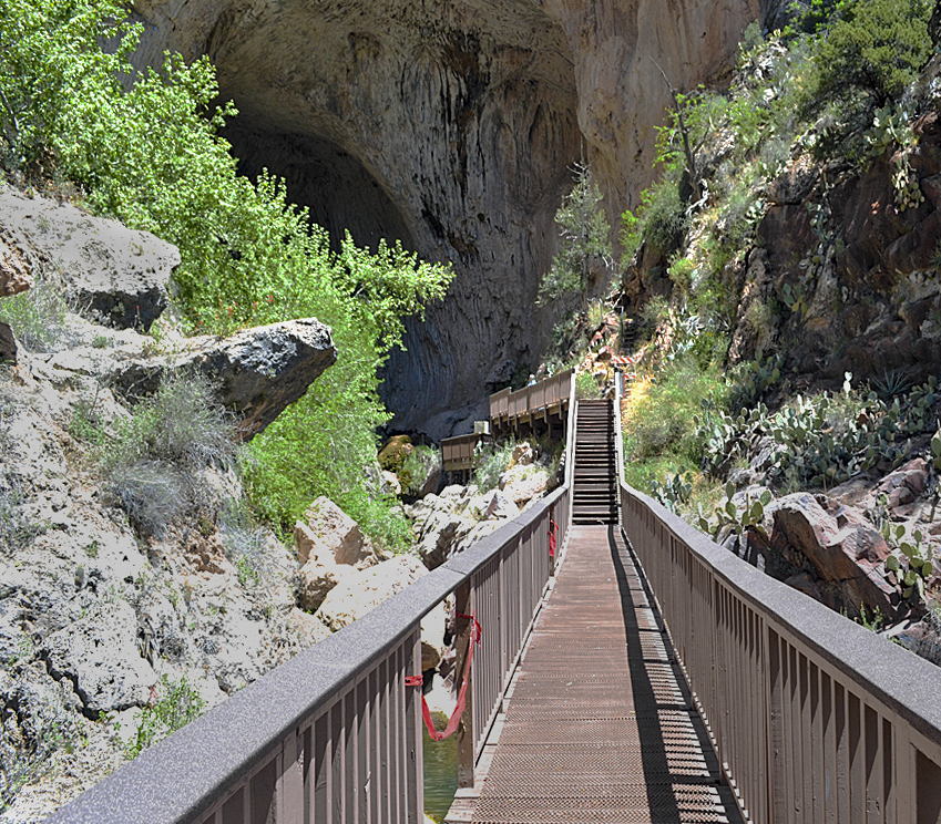 An improvement to this image would be to darken the distracting whiteness of the foreground rocks, as I attempted to do in my image below. Also cropped on the right to help give the view more of an angled look, since a visitor has to go left at the end of the bridge to get into the cave. |