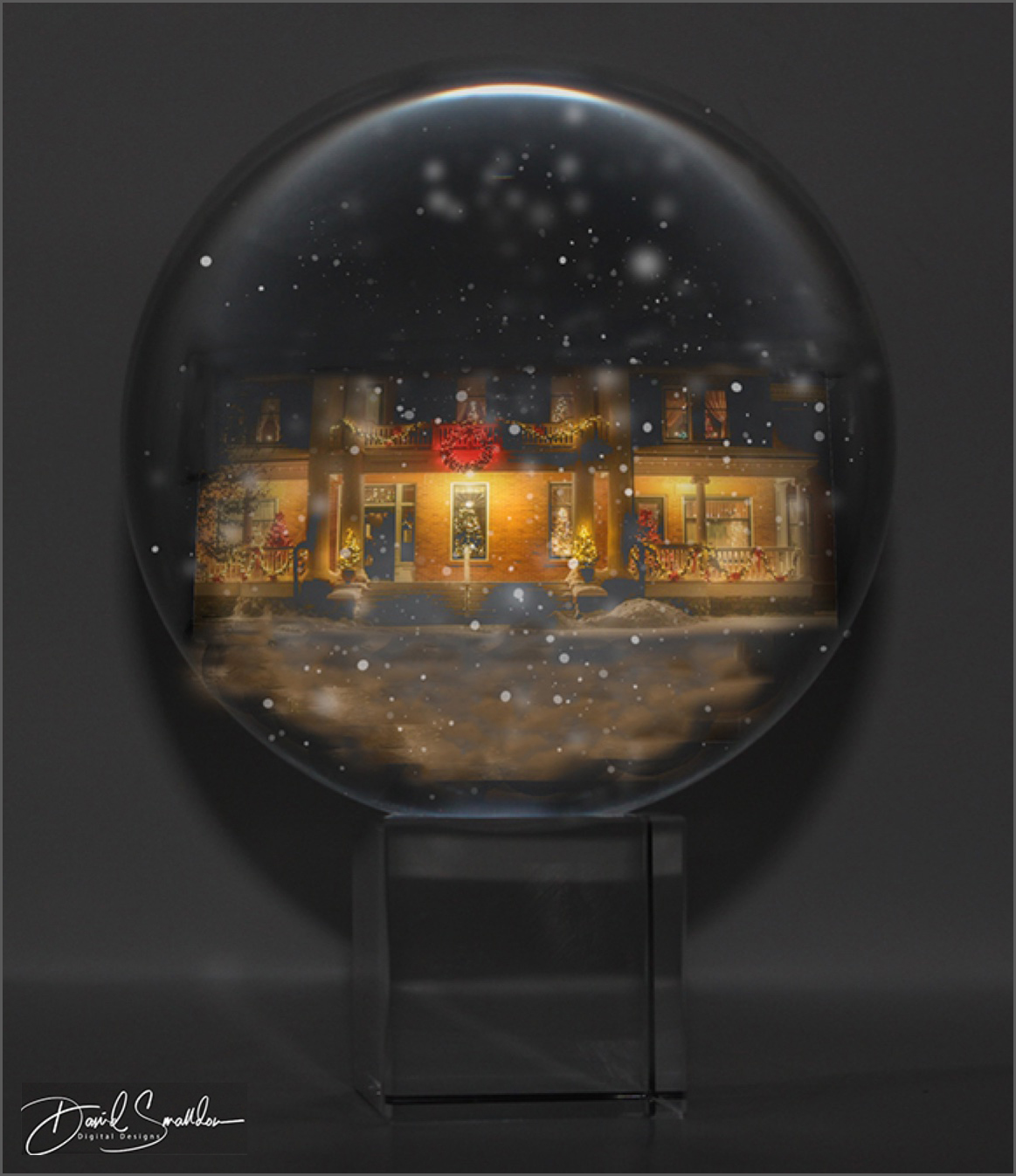 I'm intrigued by using an actual photo of a snow globe. I'm trying to figure out why it looks more like a glass disc than a sphere. I wonder how it would look if the entire house was visible, like a miniature house inside a dollhouse, and if the land on which the house sat filled the entire bottom of the disc, and if the snowflakes filled even more of the space all the way around. I thought the wide rectangle shape of the image had too much blank area on either side, so here's an idea of what it would look like with less blank area.