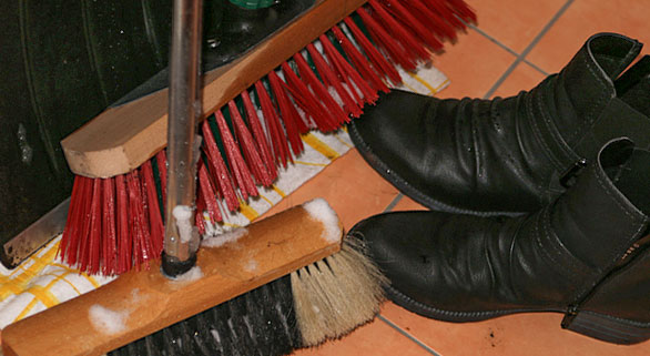 On second thought, a broom with a long handle like yours would be a great way to push the snow off a car! I always use a short-handled one. And here's my edited photo. I rotated your image to try to get rid of the large area of floor at the upper right. Someone mentioned your dark boots, so I used Shadows to produce the detail. And now I think the snow in your picture shows up better, too. |