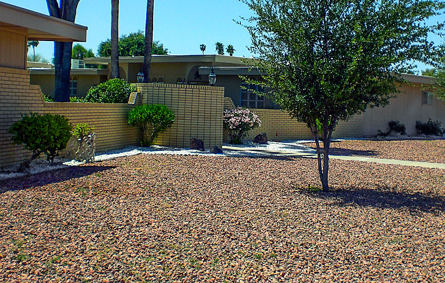 Wow, a lawn made up entirely of rocks! Because you said it was taken in Sun City, I get the feeling that it is a really hot day! The rocks comprise almost half of the photo. To make them more emphasized as the point of the picture, see my cropped version. I also added a touch of yellow in the temperature color area to warm it up. |