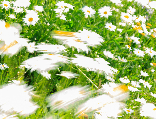 The blurred motion juxtaposed with still flowers is a dreamy, whimsical effect. The top half of the photo is the still flower section. I thought the blurry part was more fanciful, and so I've tried cropping your image to the attached photo. I was trying to eliminate the plain areas, too. I left one clear daisy at the upper left. Sure wish I had such a large area of daisies near me! They are lovely. |