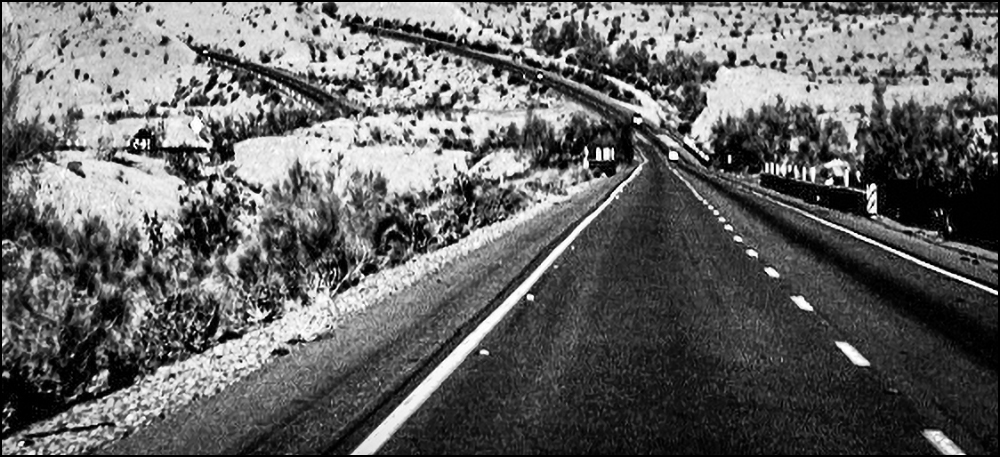 While I love the expanse of your entire image, I see the motion as being represented by the road. So I cropped it to emphasize the big lead-in line you captured with the road in front of you. The road looked too black and detail-less, so I changed the image to a black and white and lightened. Just an alternative idea!