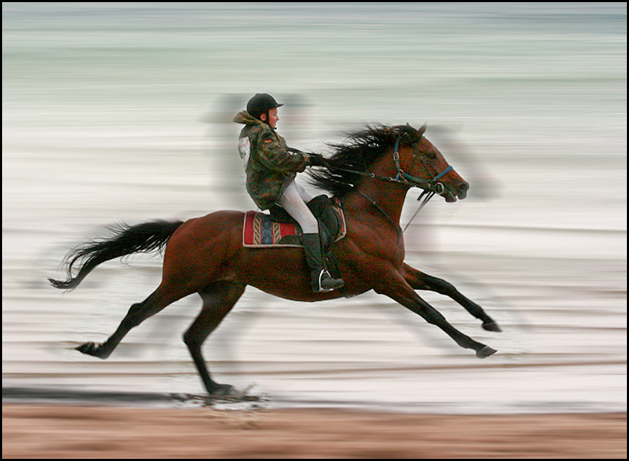 I feel the power of the horse. I feel the strong effort of the rider to control the horse. Together they look like they are going so fast that they're about to ride out of the image! The placement of the shadows is confusing but also adds to the mysteriousness of the image. As a suggestion for giving the horse some space in front of it to run into, here is a more standard crop. |