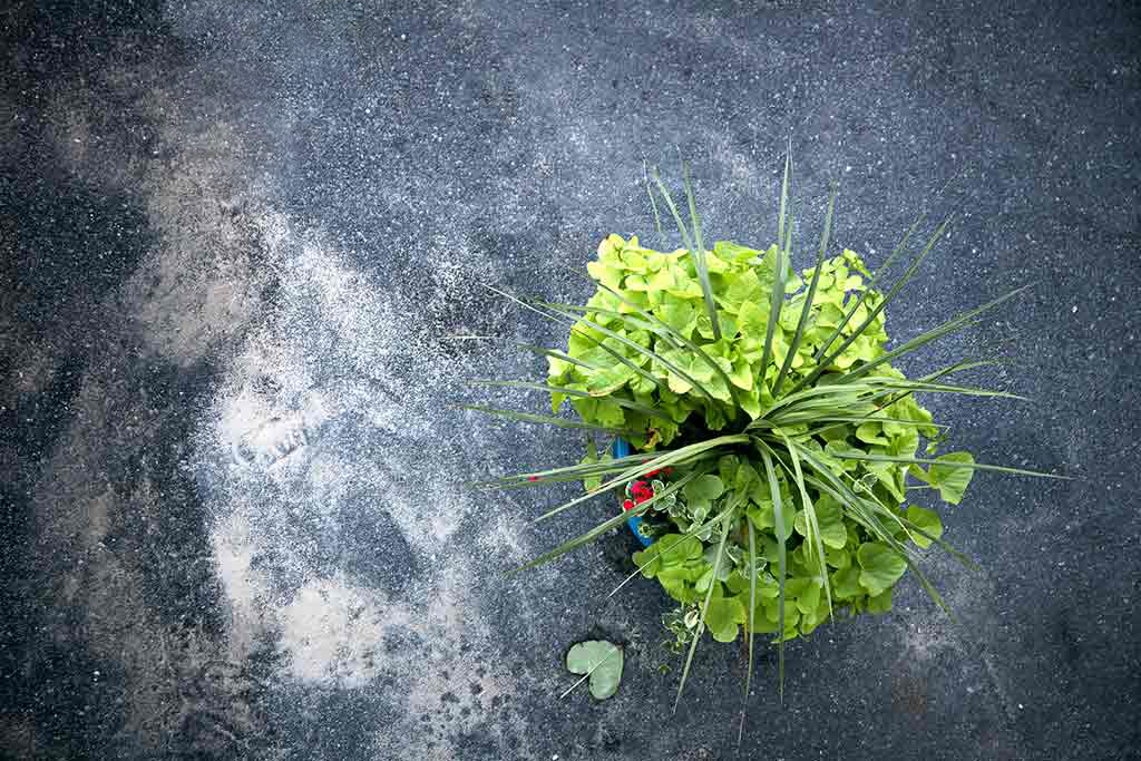 This photo has a lot going for it in terms of uniqueness. Of course, looking down, so straight down! That one lone leaf. And the pavement with its colorations and patterns. I like the idea of such an unusual presentation of an otherwise normal planter. I'm a fan over dark vignetting, too, and it works well here. I don't see anything that makes me want to grab the clone tool and make disappear! Hmmm, did you place that leaf there before you went up to the 3rd floor? ha ha |