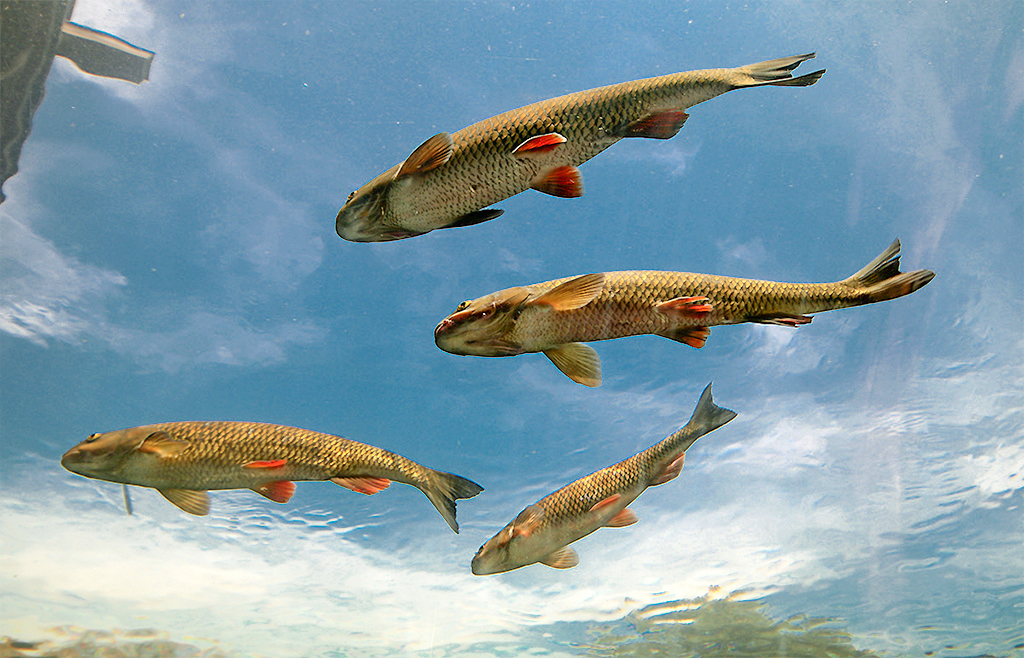 Since I read your description before studying the image, I realized these fish weren't flying in the sky! I pretended I was lying on my back looking up, just like you. Great view! It makes for a unique image. Uniqueness is good! I don't know what that object is at the upper left, but I don't find it distracting. I would like to see the fish less dark, so in Photoshop I pushed the Shadows slider to the right quite a bit. That lightened the sky too much, so I made the blue and aqua colors darker. My image doesn't look as authentic as yours, however! |