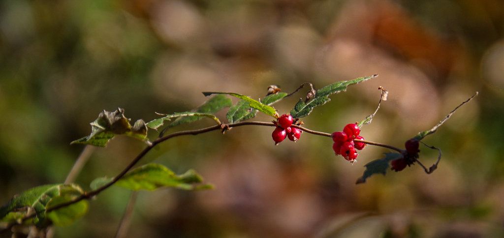 I applaud your project of hunting for a pair of... in a park! Not an easy task! Your cropping shows off the pretty red color of the berries. If I had a 400mm lens, I would have stepped back and shot the berries as a telephoto shot. The sunlit daytime lighting has deep shadows and very bright areas. When I shoot like this, I darken whatever I can around the main subject to help it not get lost in the big scene. And I brighten the shadows in my main subject. The image is, of course, no longer "as found" in person but looks less like a snapshot. See my example photo. |